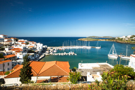 ANDROS, GREECE - APR 29, 2014: Marina of Andros, is the northernmost island of the Greek Cyclades archipelago in the Aegean Sea - area is 380 km2, 40 km long, and its greatest breadth is 16 km.