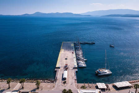Crete, Greece - May 01, 2019: Yachts and ferry boat in the port of Heraklion. Panoramic and top view. Island of Crete, Greece