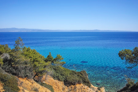 The rocky coast with pine tree overlooking the turquoise blue sea in warm summer day. Greece. Halkidiki