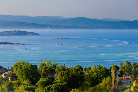 Beautiful sea with small ship. Sky and other seashore in the blue haze. Greece, Halkidiki, Kassandra.