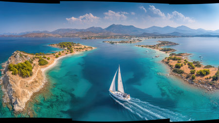 Aerial panoramic view of a marina with boats in Chalkidiki, Greece.