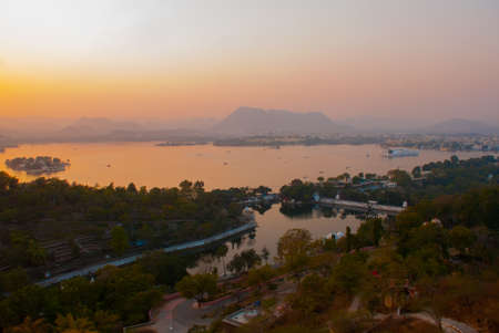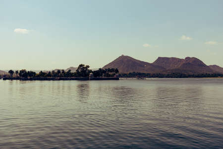 Lake, house and mountains on the horizon. Beautiful view of the city. Panorama city Udaipur, India