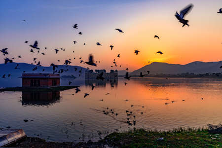 Panoramic view during Sunrise at the Jal Mahal 'Water Palace'. It is an architectural showcase of Rajput style in the Man Sagar lake in jaipur city, the capital of Rajasthan, India.
