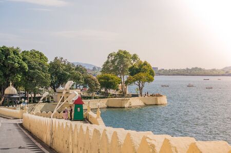 UDAIPUR, INDIA - 10 FEB, 2014 - View of the embankment at Pichola lake in Udaipur near City Palace complex