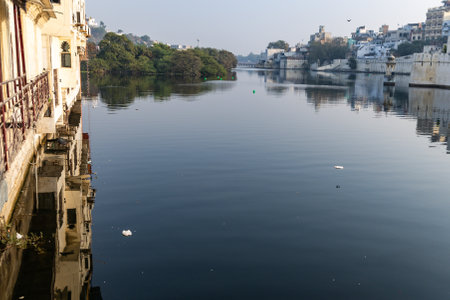 Tranquil Waterfront View of Cityscape with Historic Architecture and Reflections image is taken at Udaipur rajasthan india.