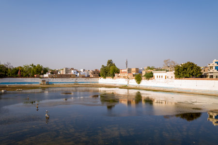 Calm waters of Sursagar Lake mirror the surrounding whitewashed walls, trees, and traditional buildings in Bikaner, Rajasthan. Clear blue sky and soft afternoon light create a peaceful cityscape with gentle reflections.