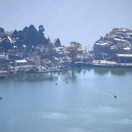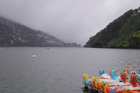 Full view of Naini Lake during evening time near Mall Road in Nainital, Uttarakhand, India, Beautiful view of Nainital Lake with mountains and blue sky