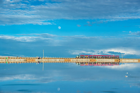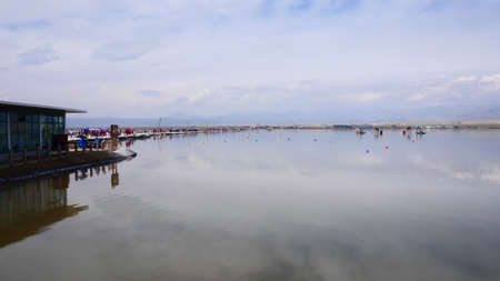 LanZhou, China, 1st of Jan 2020, wide angle scenic shot of China Chaka salt lake which is a major tourist destination and a key salt mine in Qinghai