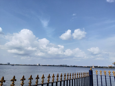 Blue sky with white clouds and golden railings on the bank of the river.