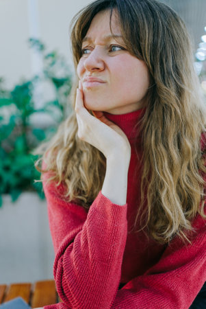 Pensive blond woman in red turtleneck leaning chin on hand, contemplating challenging situation with introspective gaze and thoughtful expression