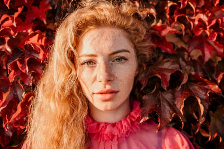 Close up shot of beautiful young caucasian woman with curly blond hair and freckles looking at camera and smiling. Cute woman portrait in a pink long dress posing on red vine leaves autumn background