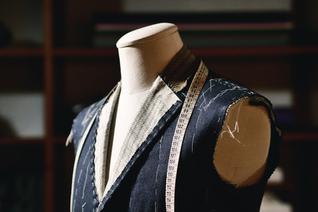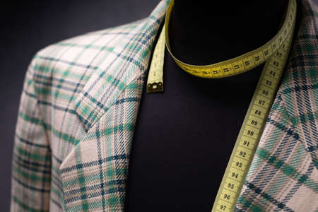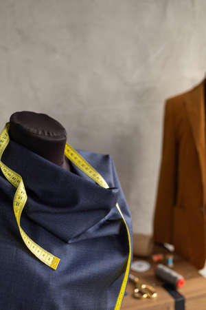 Suit jacket on tailor mannequin and tape measure. Concept of clothes atelier workplace