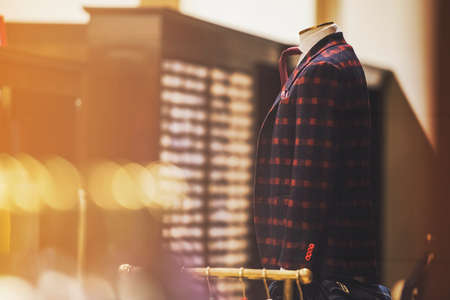 Semi-finished jacket just made by tailor on hanger against the background of other finished products, close-up