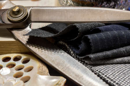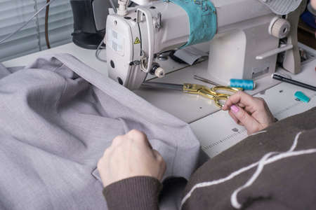 master couturier, against the background of a sewing machine, sews clothes from high quality fabric, handmade by a master professional in the manufacture of clothes