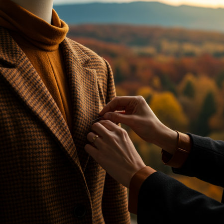 A skilled tailor carefully inspects a piece of fabric while standing next to a dress form in a vibrant studio filled