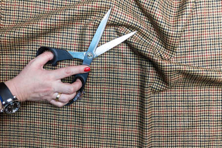 Tailor working at studio cutting fabric, detail of hand with scissors