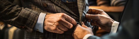 Man wearing suit after sewing suit at tailors shop. Custom made cloth. Focus point at his hand while buttoning up.