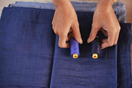 From above shot of hands of anonymous fashion designer choosing cotton thread for blue fabric while working in studio