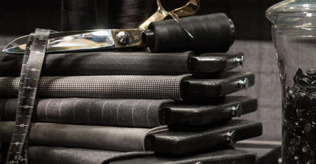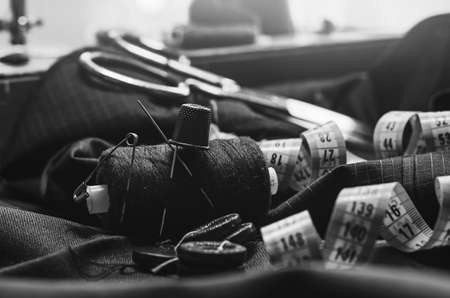 Suit jacket on tailor mannequin and sewing tools. Concept of clothes atelier workplace