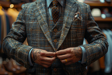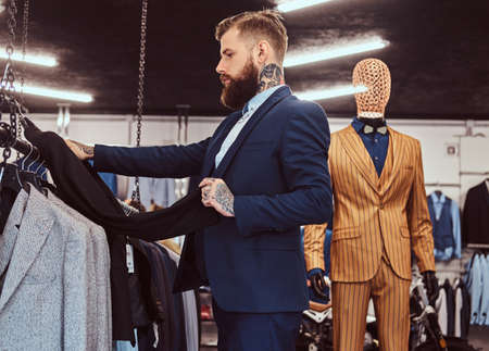 Elegantly dressed bearded male with tattoos on hands and neck chooses new suit in a menswear store.