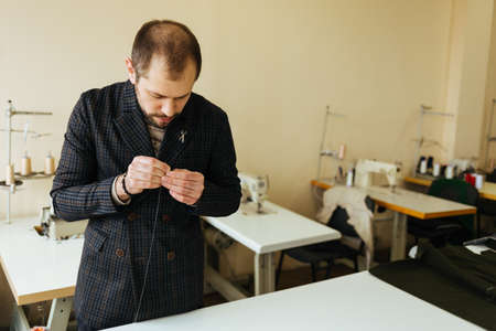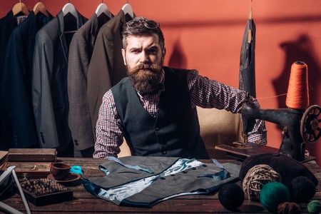 Tailor sewing. business dress code. Handmade. sewing mechanization. retro and modern tailoring workshop. Bearded man tailor sewing jacket. suit store fashion showroom. Following his personal style