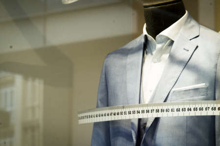 suit jacket on male tailor mannequin and tape measure, creative concept of clothes atelier