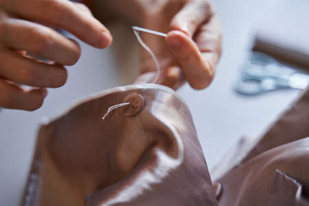 Woman sewing a button to the silk fabric while cloth repair at her cozy flat