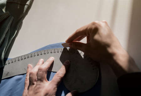 Designer using chalk to mark a pattern on fabric. tailor's hands in the atelier