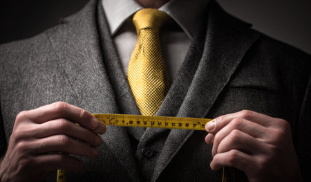 A man wearing a gray suit and a yellow tie is holding a measuring tape. The composition features a close-up shot emphasizing the textures of the fabric. The lighting suggests an indoor setting. This image could be used for various commercial purposes, including advertising and editorial content.