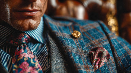 A sophisticated man adjusts his intricately designed suit jacket in a tailoring shop, showcasing elegant craftsmanship and fine textile patterns.