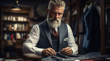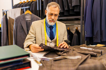 elderly good looking man in stylish and rich suit owner of atelier studio busy with work