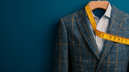 Checked jacket with measuring tape hanging on wooden hanger on blue background, showcasing tailoring, fashion design, and bespoke garment creation