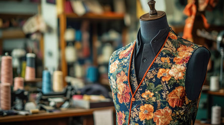A captivating floral vest displayed on a mannequin in a vibrant fashion studio, showcasing unmissable tailoring artistry and intricate textile designs that inspire creativity.