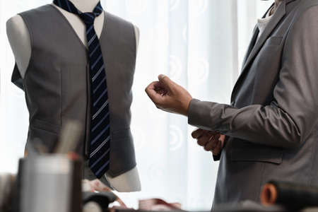 Professional experienced tailor standing at mannequin with jack in his atelier studio