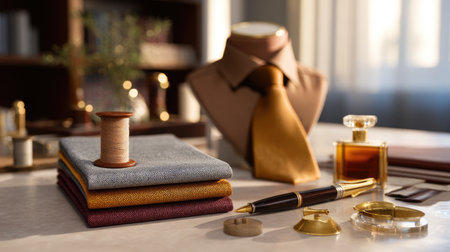A sophisticated workspace featuring neatly stacked fabrics, elegant accessories, and a refined atmosphere perfect for tailoring and fashion design.