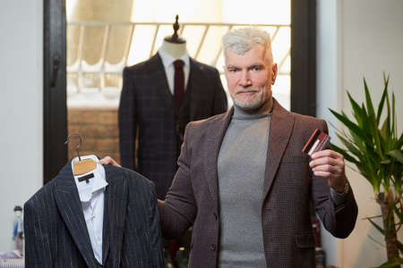 A mature man with gray hair and a sporty physique is posing with a wool suit and a credit card in a clothing store. A male customer with a beard wears a suit in a boutique.