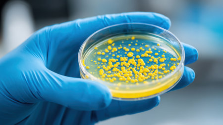 A detailed image showing a petri dish filled with vibrant yellow bacterial colonies held in a gloved hand against a black background, showcasing laboratory analysis.