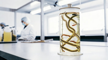 A glass container with a swirling liquid showcasing a vibrant mix of genetically altered microorganisms with lab instruments and safety gear in the background..
