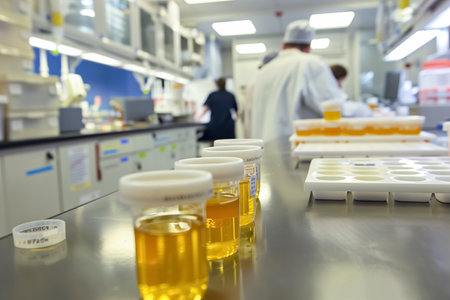 In a medical lab, scientists are meticulously analyzing numerous urine samples for testing, ensuring precise and reliable results in their research