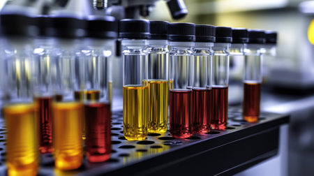 A vibrant display of glass test tubes filled with red, orange, and yellow liquids showcases scientific experimentation in a well-equipped laboratory environment.