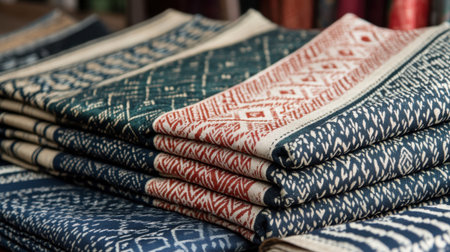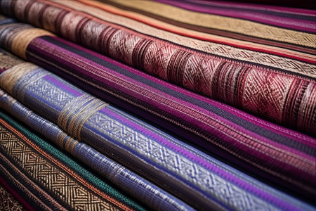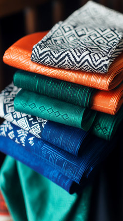 A captivating collection of colorful textiles featuring intricate patterns. This traditional display highlights the rich cultural heritage and skilled craftsmanship in textile art.