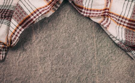Kitchen table with tablecloth and space for your recipe or menu. Top view flat lay.