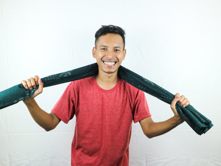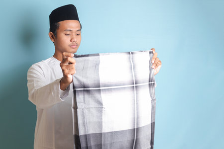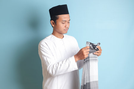 Portrait of Asian muslim man in white koko shirt folding and tidy up his sarung . Isolated image on blue background