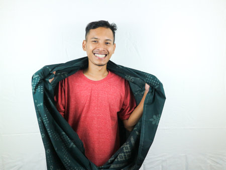 A portrait of handsome Asian Malay man wearing a blue traditional Baju Melayu with songkok on head and kain sampin on waist during the Eid Aidilfiitri celebration. Selective focus on object.
