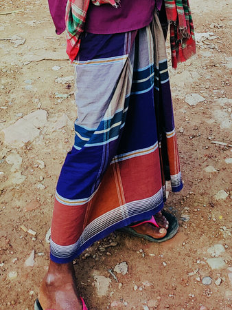Colorful striped fabric wraps around legs in dusty outdoor setting during sunny day while standing barefoot