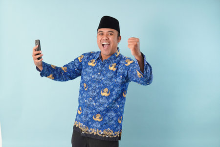 Handsome government worker man wearing blue batik uniform holding smartphone while smiling. PNS and civil servant concept.