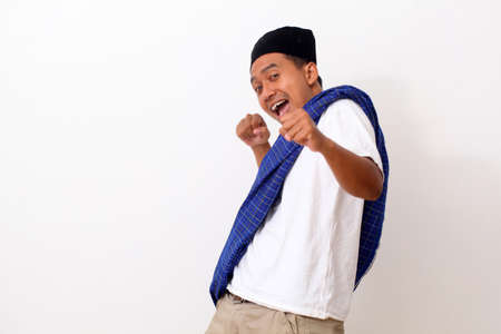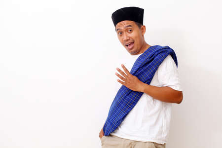 Portrait of happy asian man using cap. Isolated on white background. Ramadan concept