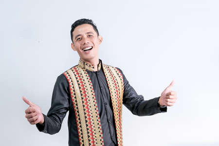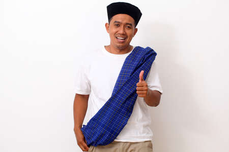 Portrait of a handsome young asian muslim man wearing traditional clothes