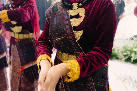 An image featuring cultural performers in opulent traditional attire showcasing a vibrant display of heritage, focusing on ornate velvet fabric and intricate gold embellishments, capturing the