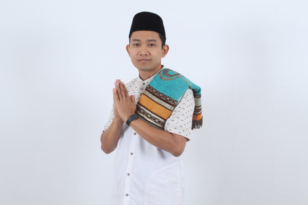 Portrait of a sincere Asian Muslim man in traditional attire greeting for the holy month of Ramadan or Eid al-Fitr (Lebaran) celebration.